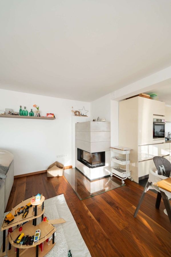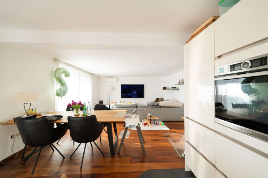 Der offen gestaltete Wohn- und Essbereich bildet das Herzstück der Immobilie. Großzügige Fensterflächen sorgen für eine helle und einladende Atmosphäre und ermöglichen den direkten Zugang zu Balkon und Garten. So entsteht ein harmonischer Übergang zwischen Innen- und Außenbereich mit hoher Wohnqualität.