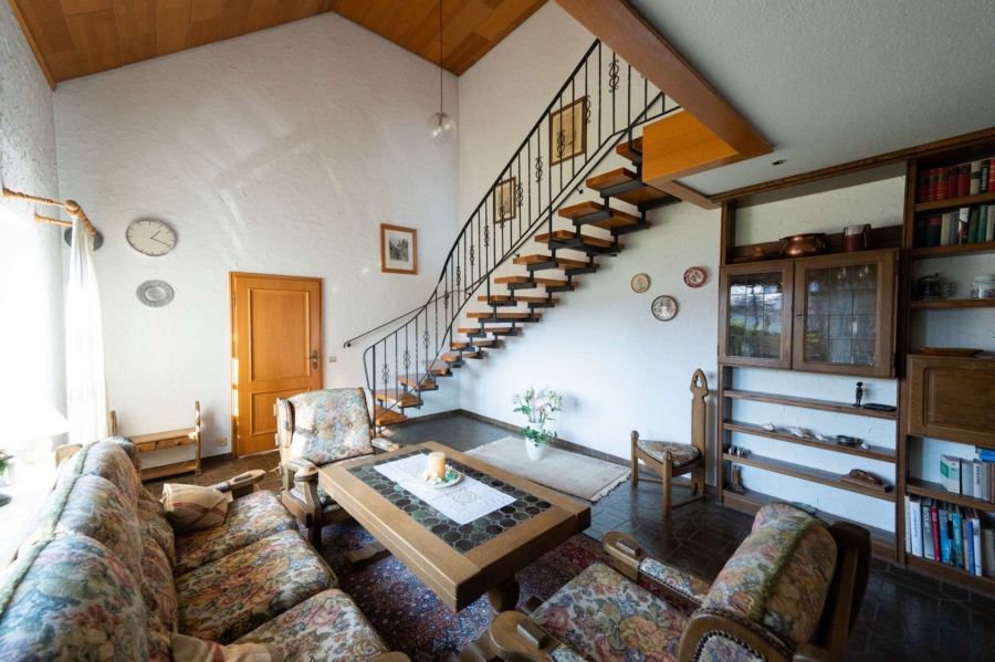 Die Immobilie bietet eine Wohnfläche von ca. 173 m² und eine klassische, großzügige Raumaufteilung. Große Fensterflächen sorgen für helle Wohnräume und eine angenehme Wohnatmosphäre. Besonders hervorzuheben ist der großzügige, teilweise galerieartig gestaltete Wohnbereich, der dem Haus ein offenes Raumgefühl und eine besondere Wohnqualität verleiht.