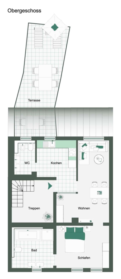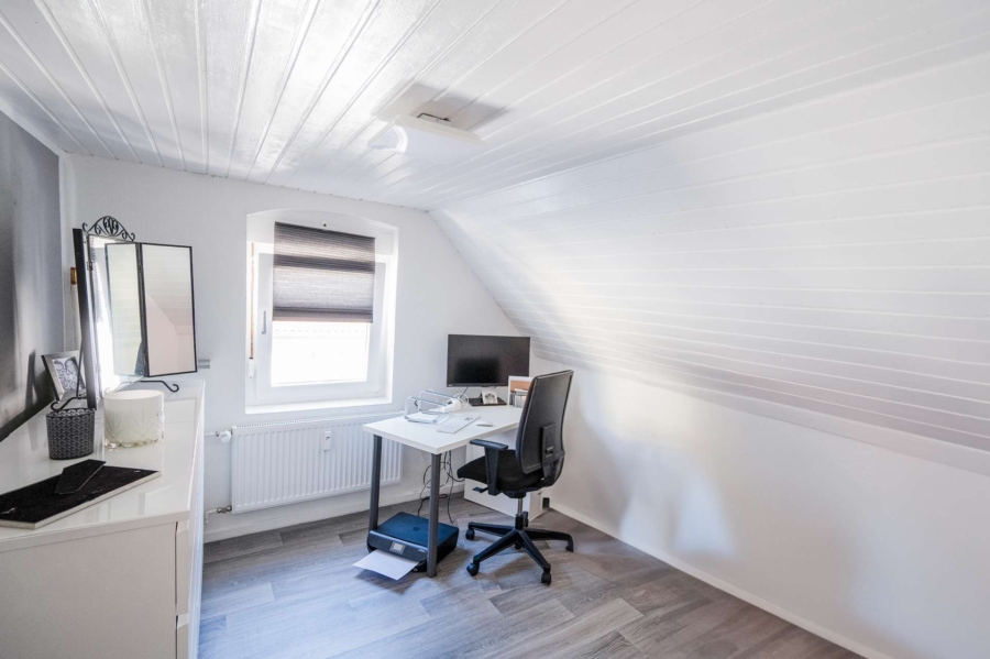 Die Wohneinheit im Obergeschoss ist autark organisiert, funktional geschnitten und durch das ausgebaute Dachgeschoss sinnvoll ergänzt. Die großzügige Dachterrasse bildet einen ruhigen Rückzugsraum mit hoher Privatsphäre und rundet das Gesamtbild der Immobilie stimmig ab.