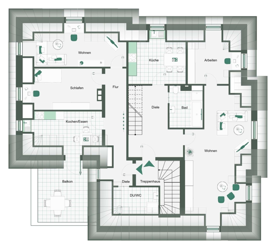 WE3 | 1. OG | 198 m² (WG): 4Z, Küche, Diele, Bad mit Dusche & Wanne, Gäste-WC, Balkon, Dachterrasse