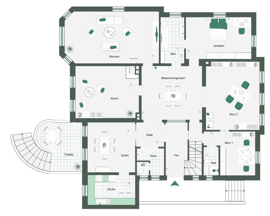 WE2 | EG | 220 m² (nach Absprache frei): 5Z, Küche, Esszimmer, Diele, 2 Bäder, Gäste-WC, Gartenzugang