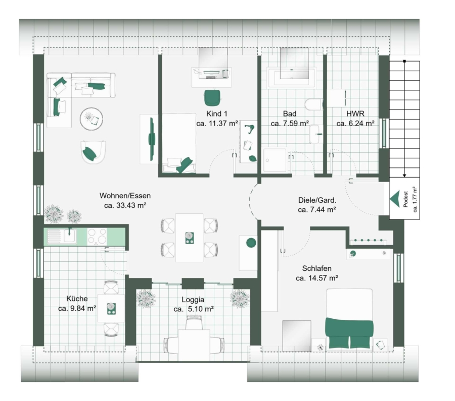 Die Obergeschosswohnung mit ca. 97 m² ist durchdacht geschnitten, verfügt über zwei Schlafzimmer, ein modernes Badezimmer, eine separate Küche sowie eine helle Loggia als Rückzugsort im Freien.