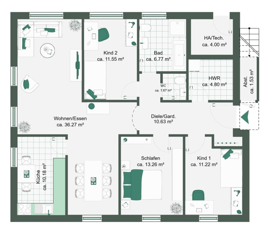 Die Erdgeschosswohnung mit ca. 115 m² besticht durch ihren großzügigen Wohn-/Essbereich, drei Schlafzimmer, eine separate Küche sowie ein modernes Bad mit zusätzlichem Gäste-WC.