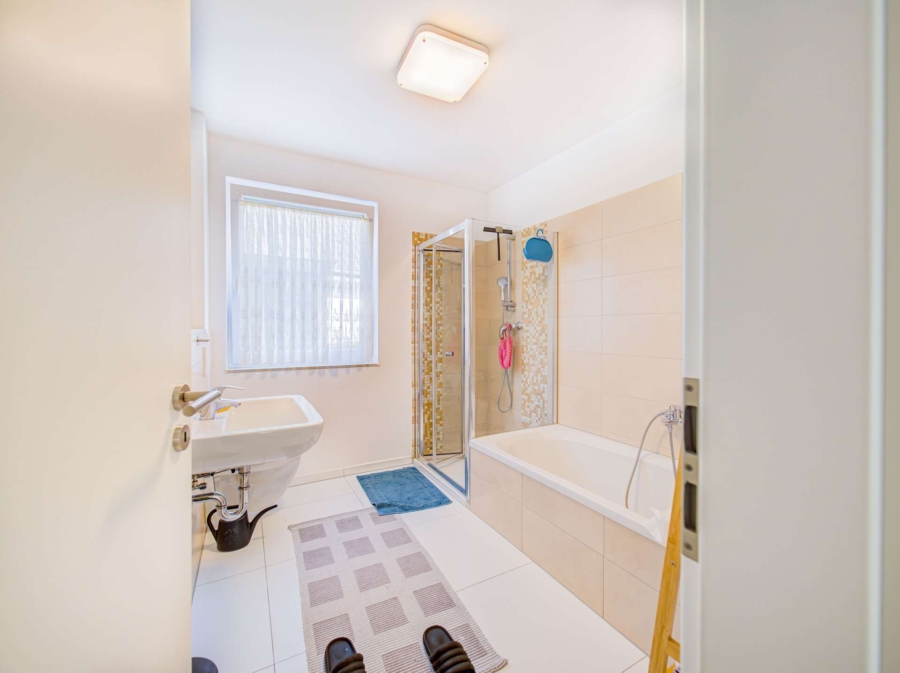 Beide Badezimmer sind geschmackvoll gestaltet, in der Erdgeschosswohnung ergänzt durch ein separates Gäste-WC.