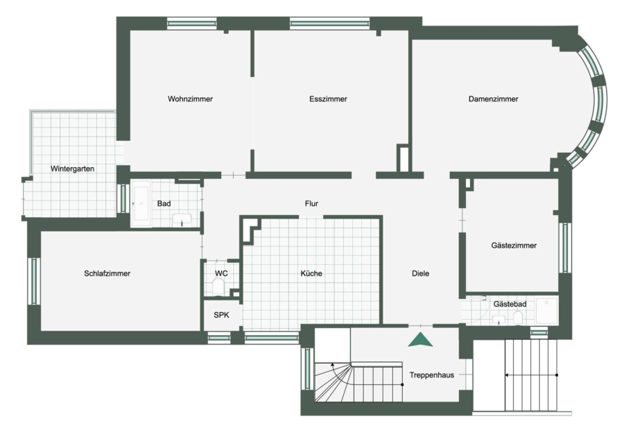 Schon beim Eintreten spürt man die besondere Ausstrahlung. Das Erdgeschoss empfängt mit einer klassischen Raumstruktur, altbautypischen Deckenhöhen und einem lichtdurchfluteten Wintergarten, der den Wohnbereich in den Garten erweitert, ein Ort der Ruhe mit Blick ins Grüne.