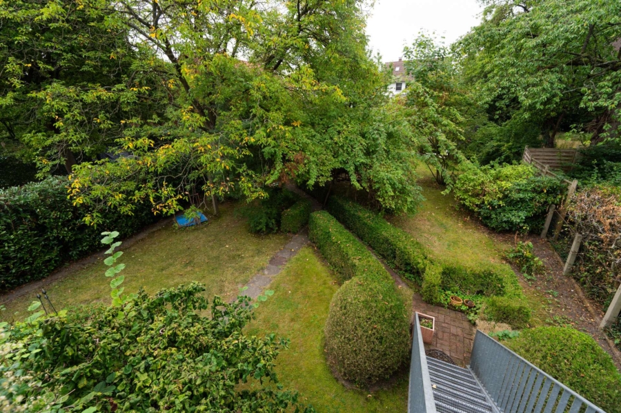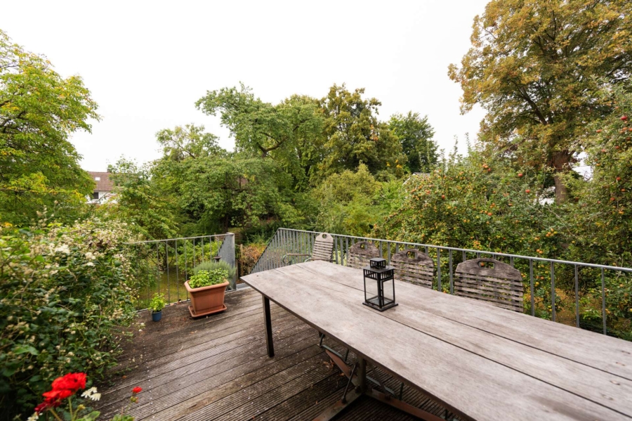 Im Obergeschoss wiederholt sich der großzügige Grundriss, ergänzt durch einen straßenseitigen Balkon, einen Gartenbalkon und einen stilvollen Kaminofen, der dem Raum in der kalten Jahreszeit eine besondere Atmosphäre verleiht.