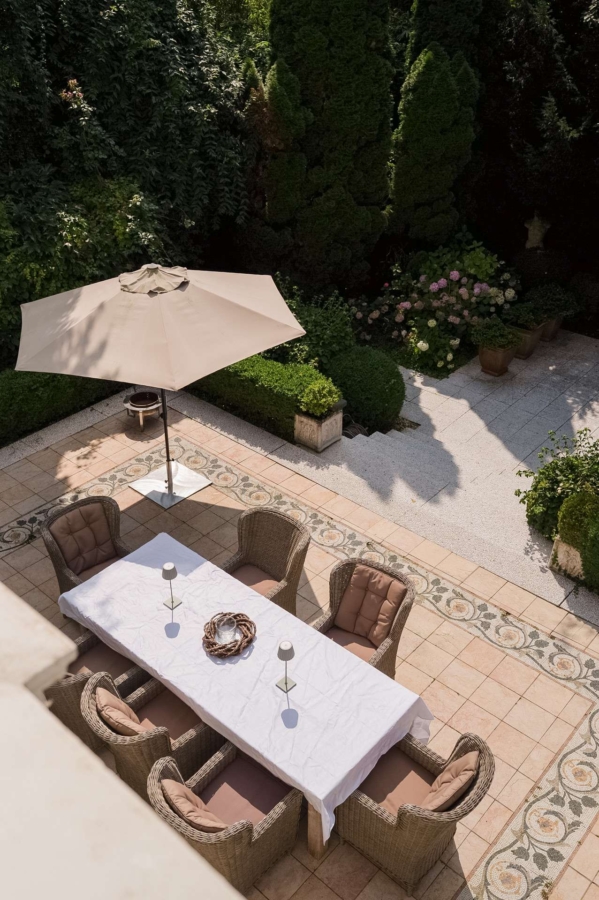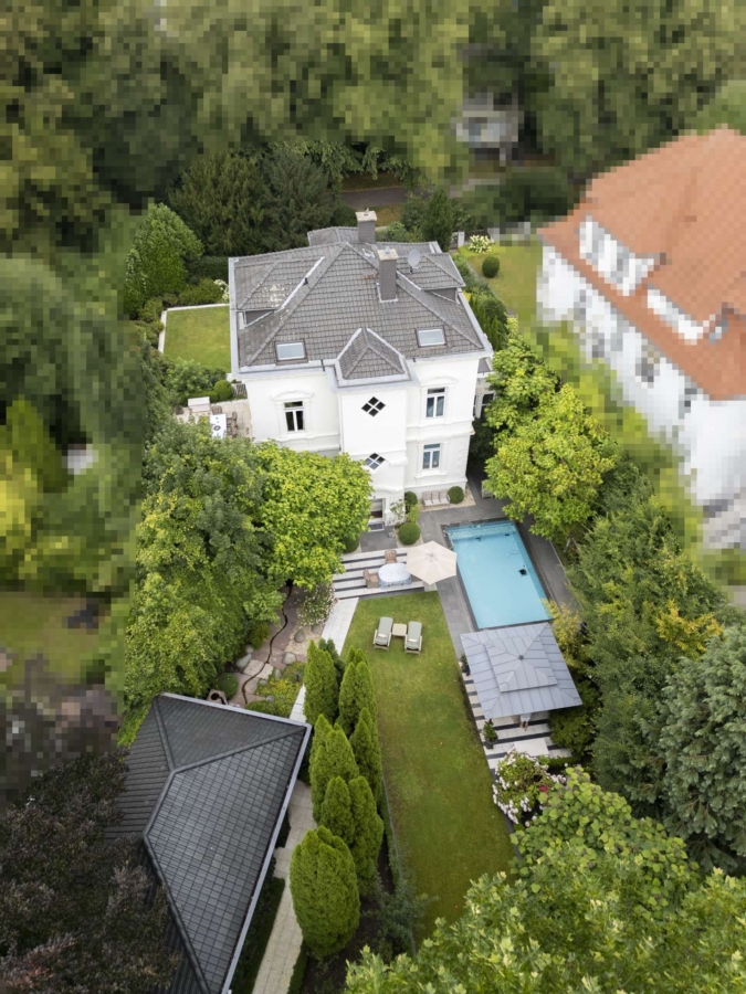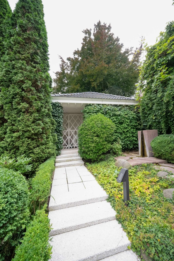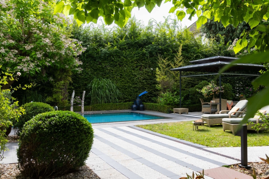 Der Garten erzählt seine ganz eigene Geschichte: Zwei großzügige Terrassen (ca. 49,88 m² und 10,36 m²), ein beheizter, bodenbündiger Pool mit Bisazza-Fliesen, eine separate Schieferdusche im Grünen, ein Wasserspiel, jedes Detail lädt zum Verweilen ein.
