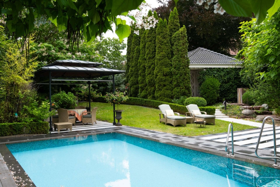 Die gesamte Pooltechnik wurde 2022 erneuert, das Ensemble wirkt gepflegt bis ins letzte Beet.
