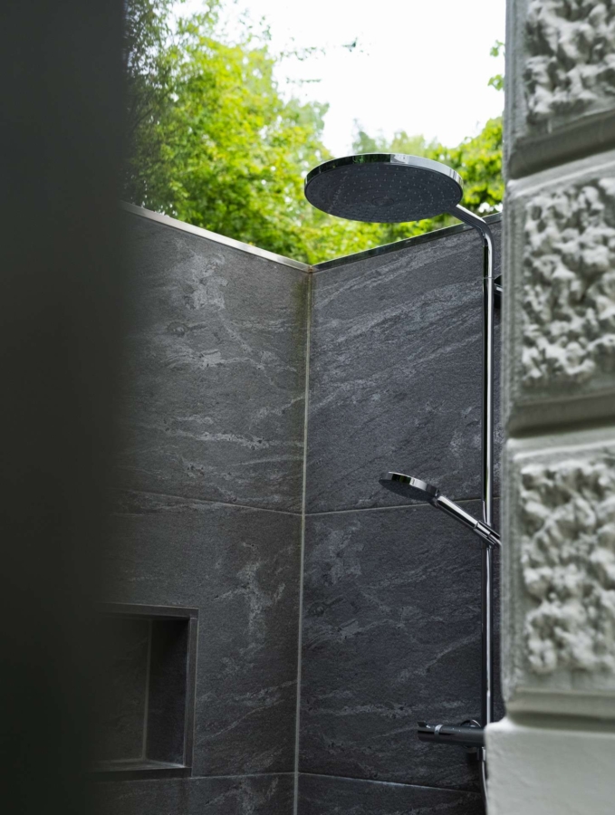 Die Bäder fügen sich unaufgeregt ins Konzept: freistehende Wanne, separates Duschbad, Bidet und ein Gäste-WC mit Bisazza-Mosaiken im Souterrain.