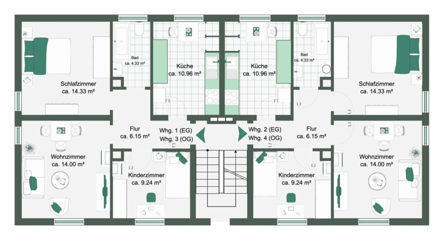 Die Wohnungen verfügen jeweils über ca. 60 m² Wohnfläche und bieten funktionale, gut vermietbare Grundrisse mit klarer Raumstruktur. Diese Wohnungsgrößen sprechen eine breite Zielgruppe an, insbesondere Singles, Paare sowie Berufspendler und gewährleisten eine nachhaltige Vermietbarkeit.