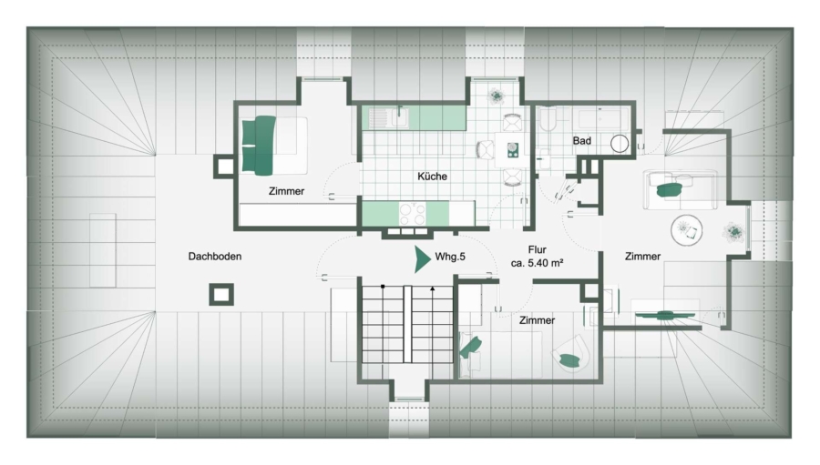 Darüber hinaus besteht die Möglichkeit, den aktuell nicht ausgebauten Dachbodenbereich weitergehend zu prüfen. Vorbehaltlich baurechtlicher Genehmigungen und technischer Umsetzbarkeit könnte hier zusätzlicher Wohnraum geschaffen und somit weiteres Ertragspotenzial realisiert werden.