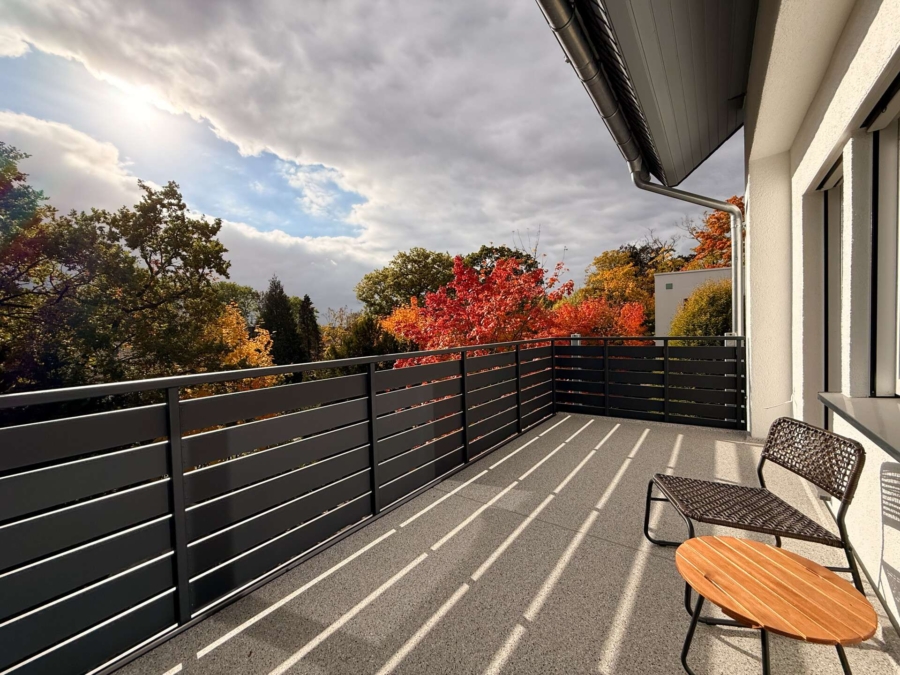 Das Wohnhaus fügt sich harmonisch in die Umgebung ein, weiße Fassade, klare Linien, moderne Architektur. Auf dem Süd-West-Balkon lässt sich der Abend in sonniger Ruhe genießen.