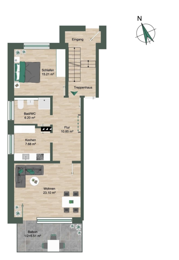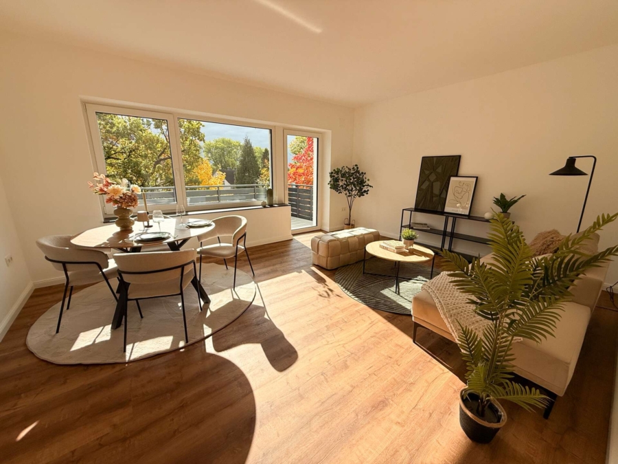 Die durchdachte Raumaufteilung mit offenem Wohn- und Essbereich, großzügigem Schlafzimmer und Süd-West-Balkon schafft ein helles, einladendes Wohngefühl. Große Fensterflächen, dezente Farben und edle Materialien lassen viel Licht und Leichtigkeit entstehen, ein Zuhause mit Charakter, das Wärme und Klarheit zugleich ausstrahlt.