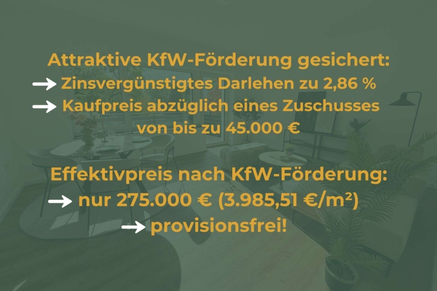 Effektivpreis nach KfW-Förderung: nur 275.000 € (3.985,51 €/m²) – provisionsfrei!