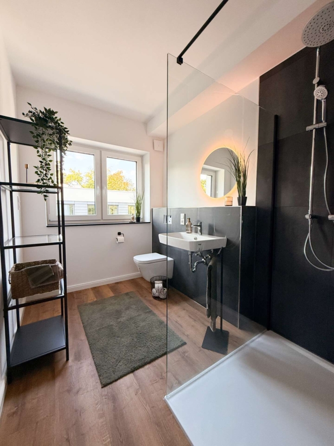 Innen dominieren helle, natürliche Materialien: Vinylboden in Eiche-Optik, weiße Türen mit eleganten Fräsungen und silberner Beschlaggarnitur schaffen ein harmonisches Wohnambiente. Das Tageslichtbad bietet eine großzügige Walk-In-Dusche, hochwertige Armaturen sowie einen elektrischen Handtuchheizkörper, vorbereitet für ein optionales Dusch-WC.