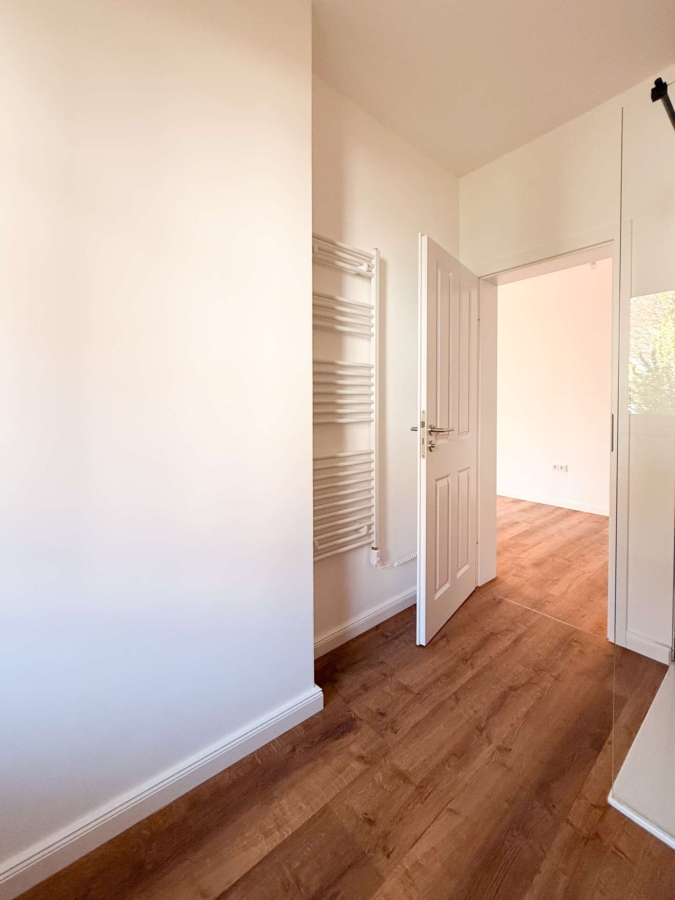 Innen dominieren helle, natürliche Materialien: Vinylboden in Eiche-Optik, weiße Türen mit eleganten Fräsungen und silberner Beschlaggarnitur schaffen ein harmonisches Wohnambiente. Das Tageslichtbad bietet eine großzügige Walk-In-Dusche, hochwertige Armaturen sowie einen elektrischen Handtuchheizkörper, vorbereitet für ein optionales Dusch-WC.