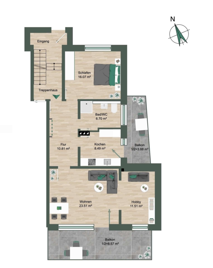 Die großzügige, durchdacht geplante Raumaufteilung mit offenem Wohn- und Essbereich, einem weitläufigen Schlafzimmer und zwei Balkonen schafft ein außergewöhnlich helles und einladendes Wohngefühl.