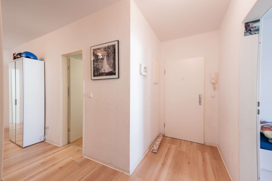 Beim Betreten der Wohnung empfängt Sie ein weitläufiger Dielenbereich, der Ihnen viel Platz für Stauraum und individuelle Gestaltungsmöglichkeiten bietet. Die angrenzende Küche besticht durch ihre Funktionalität und bietet ausreichend Platz für einen Esstisch, sodass hier gesellige Mahlzeiten im Kreise der Familie oder mit Freunden genossen werden können.