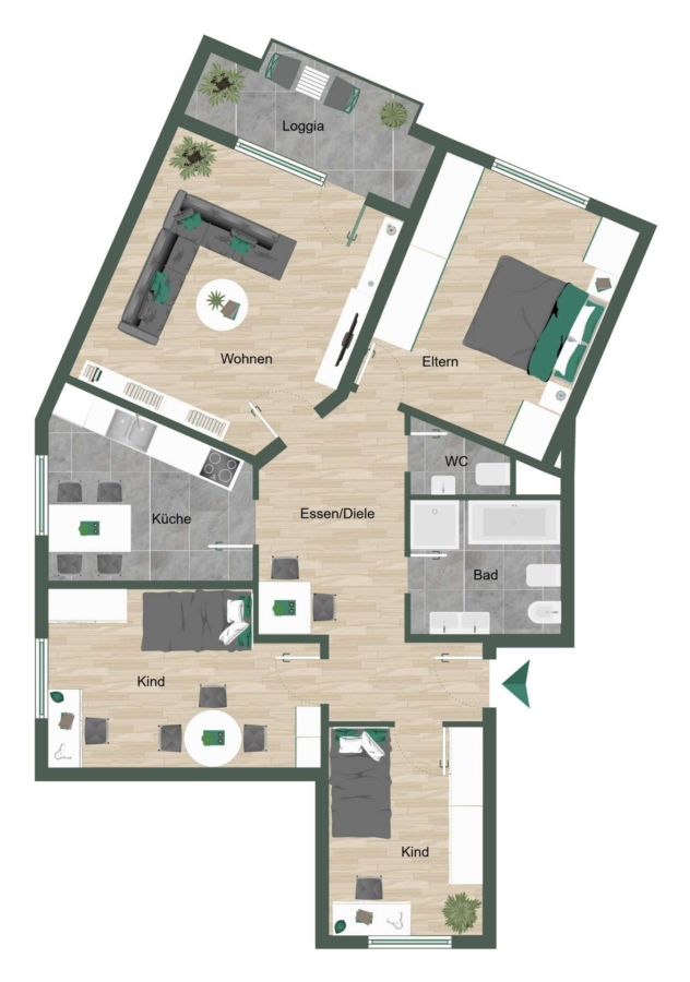Das großzügige Wohnzimmer überzeugt durch seine Helligkeit und die harmonische Verbindung zum überdachten Balkon. Hier können Sie entspannte Stunden im Freien verbringen und den Blick ins Grüne genießen. Drei geräumige Schlafzimmer bieten vielseitige Nutzungsmöglichkeiten – ob als Kinderzimmer, Gästezimmer oder Homeoffice – hier ist genug Platz für Ihre individuellen Wohnideen.