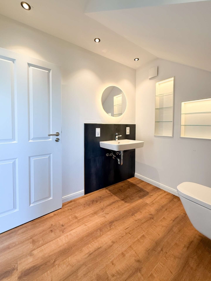 Innen dominieren helle, natürliche Materialien: Vinylboden in Eiche-Optik, weiße Türen mit eleganten Fräsungen und silberner Beschlaggarnitur schaffen ein harmonisches Wohnambiente. Das Tageslichtbad bietet eine großzügige Walk-In-Dusche, hochwertige Armaturen sowie einen elektrischen Handtuchheizkörper, vorbereitet für ein optionales Dusch-WC.