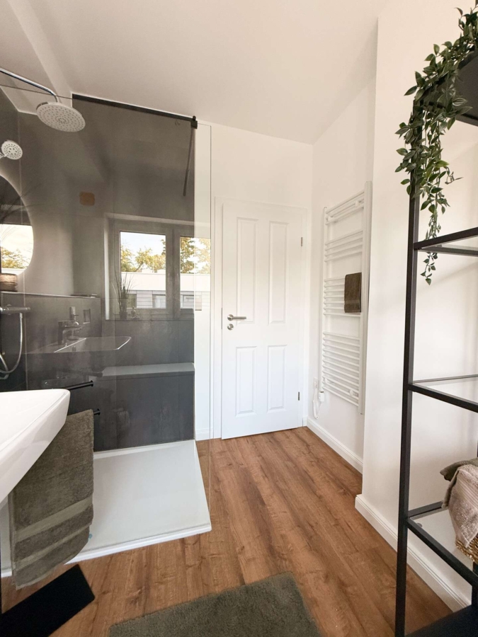 Das stilvolle Tageslichtbad ist hochwertig ausgestattet und verfügt über eine großzügige Walk-In-Dusche sowie moderne Armaturen.